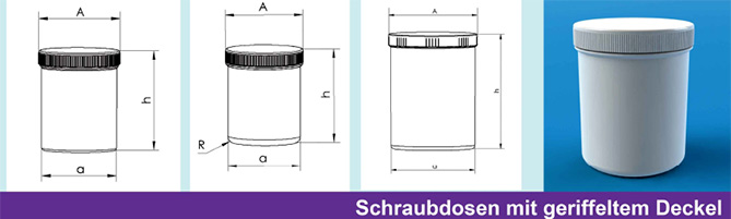 Schraubdosen mit geriffelten Deckeln, Dosenboden gerade. ... weiter zum Datenblatt: |