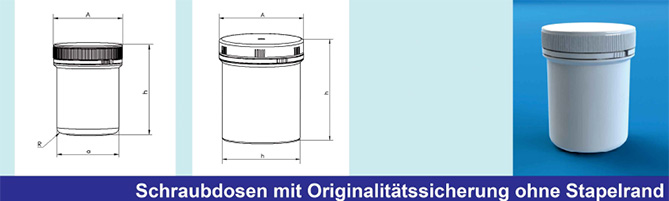 Schraubdosen mit Originalitätssicherung mit unterbrochen geriffelten Deckeln ohne Stapelrand. ... weiter zum Datenblatt: |